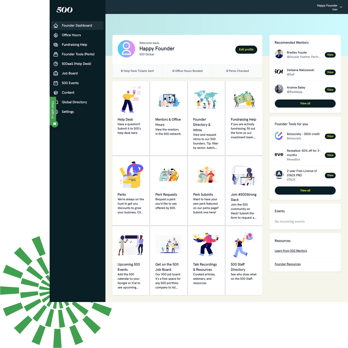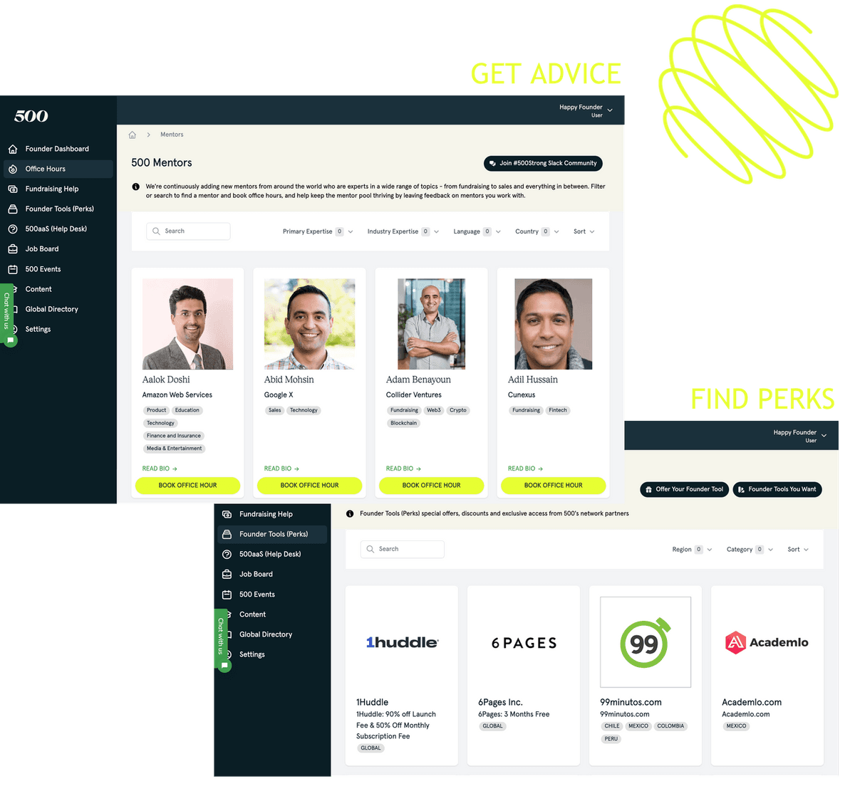 Connect with 500's extensive global network of founders, mentors, and investors. Redeem perks, access exclusive events, and meet like-minded people.